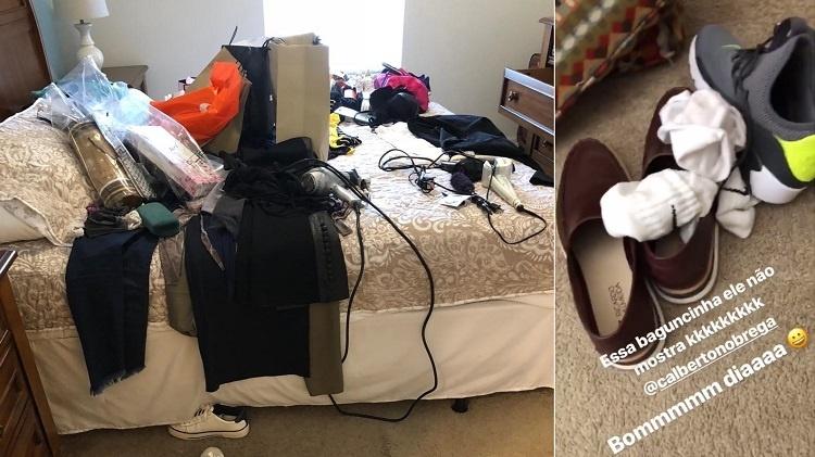 Carlos Alberto e Renata se divertiram até na bagunça. O humorista provocou a mulher, que deixou a cama toda desarrumada: "Para os homens, esse móvel foi feito para deitar... dormir... para as mulheres, é a continuidade dos armários já abarrotados!". A médica "revidou" mostrando os calçados do marido espalhados no chão: "Essa baguncinha ele não mostra"
