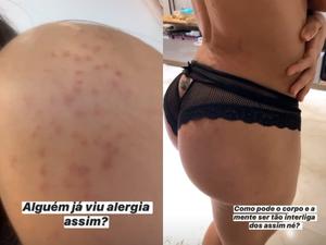 Ainda nas redes sociais, a ex-BBB mostrou a alergia que está espalhada pelo seu corpo devido ao estresse causado pelo fim do relacionamento.