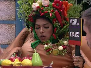 Cumprindo castigo do monstro no "BBB 21", Projota e Pocah não param de reclamar. Os dois estão vestidos de brócolis e frango, respectivamente, e precisam ficar em uma marmita no jardim toda vez que a produção toca a música do castigo.