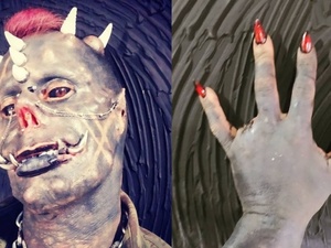 O tatuador busca assumir um visual de um demônio e já adicionou chifres, presas e, recentemente, amputou um dos dedos, para dar a aparência que possui quatro garras em suas mãos.